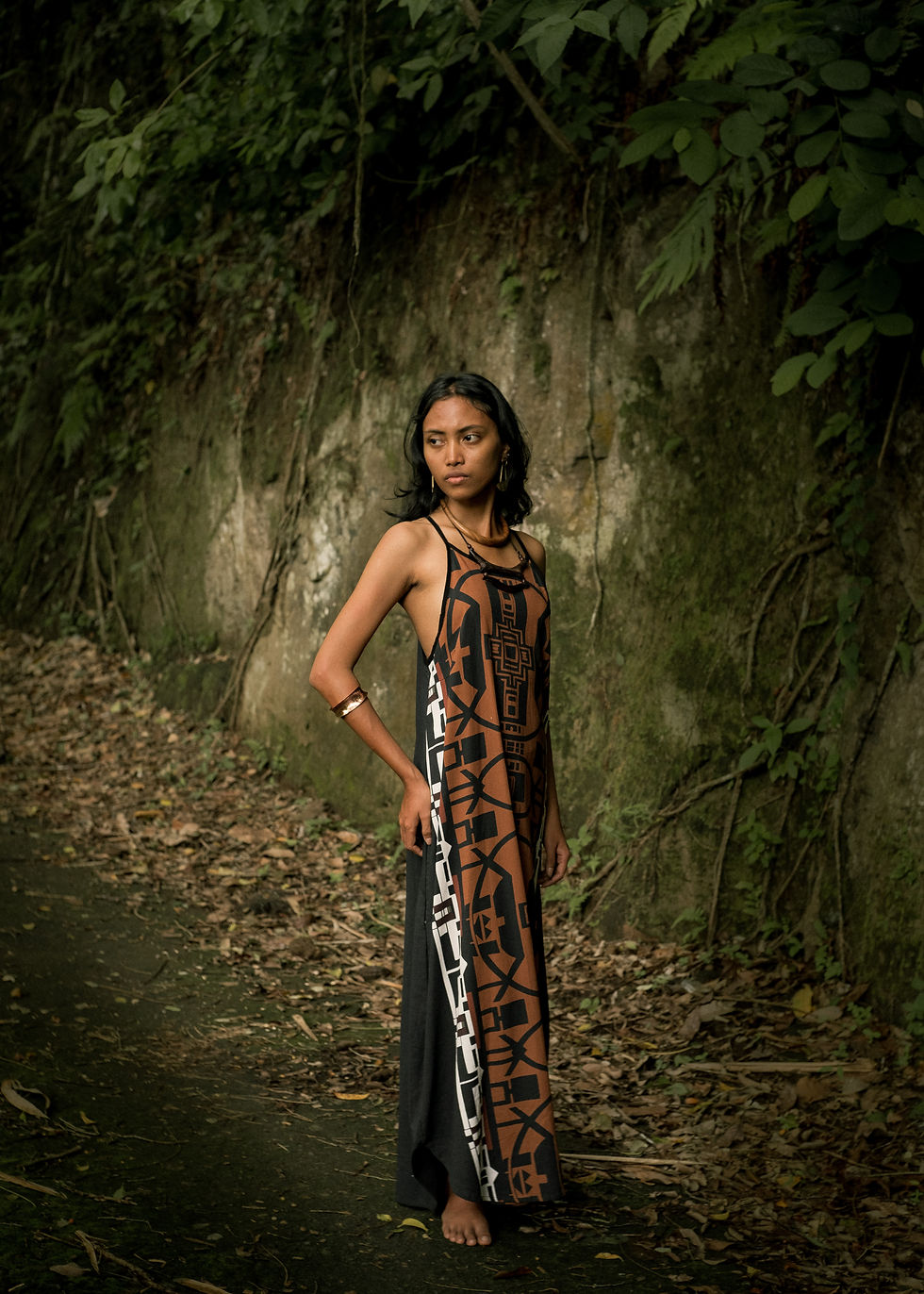 Gypsy Dreaming Halter dress – Bronze 'Petroglyph' Print